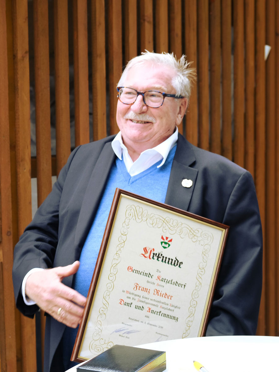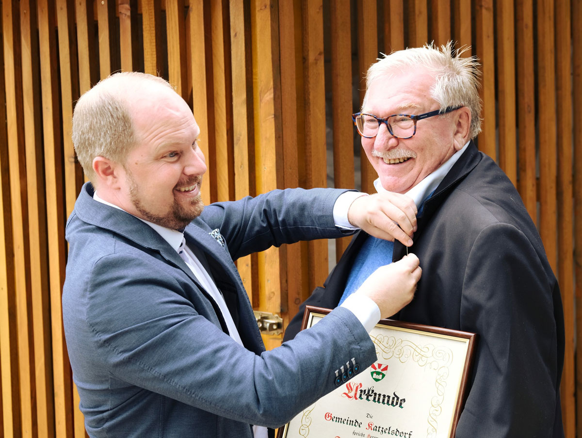 Herr Bürgermeister Michael Nistl betonte in seiner Ansprache, die touristische Wichtigkeit des Museums für Katzelsdorf. Katzelsdorf hat durch die Zinnfigurenwelt ein Alleinstellungsmerkmal unter den Gemeinden. Als besonderes Dankeschön an den Museumsleiter, der sich seit Beginn unermüdlich und ehrenamtlich für die Zinnfigurenwelt einsetzt, überreichte Bürgermeister Michael Nistl dem Museumsleiter Franz Rieder die Ehrennadel der Gemeinde Katzelsdorf.