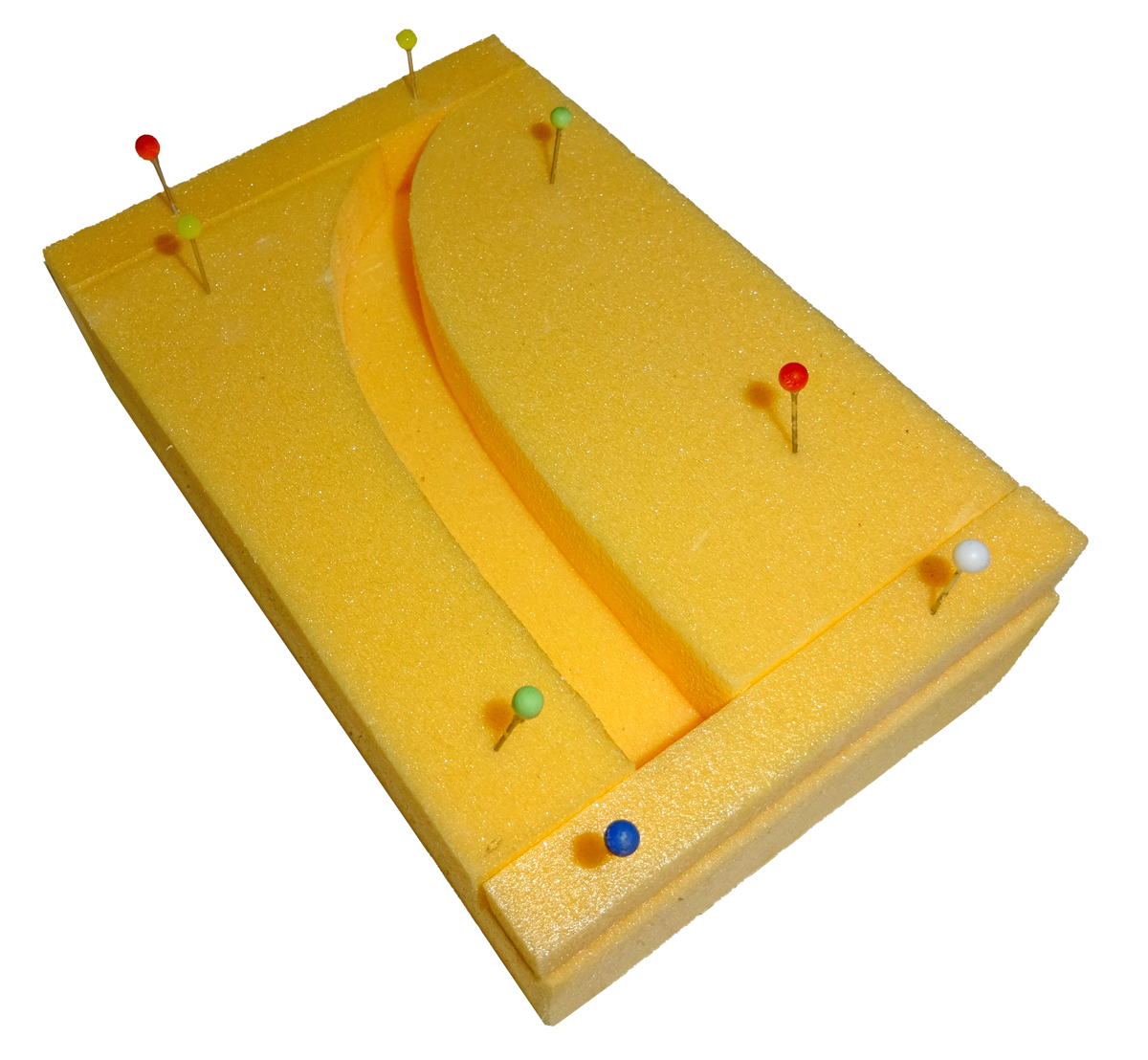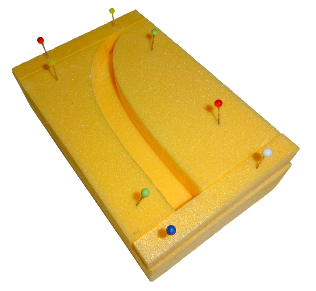 Eine einfache gerade Form kann aus Holzteilen zusammengesetzt werden, aber auch ein Karton ist sehr hilfreich. Gebogene Formen sind am einfachsten in Styrodur herzustellen. Es wird ein Styrodur-Block als Grundelement verwendet. Die gebogenen Seitenwände werden mit einer Laubsäge rund geschnitten. Die gerundeten Teile werden mit Stecknadeln auf den Block fixiert und der Gips kann eingegossen werden. Wichtig vorher die Schablone mit Vaseline etwas einfetten.